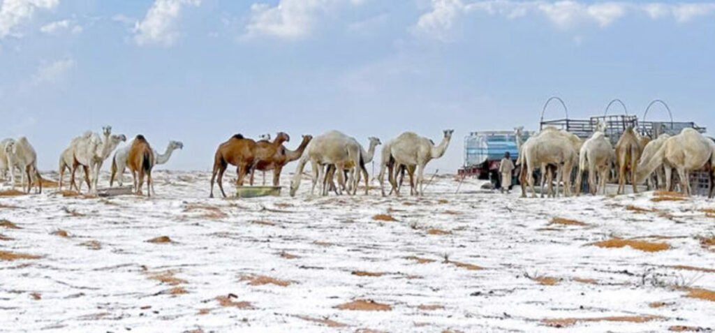 Arabia Saudita vivió una inusual nevada que cubrió de blanco al desierto-. Una espectacular tormenta invernal cubrió de blanco el desierto de Arabia Saudita, transformando las extensiones áridas en paisajes gélidos, ya que zonas del norte y noroeste del país amanecieron bajo una capa de nieve tras varios días de inestabilidad climática constante.