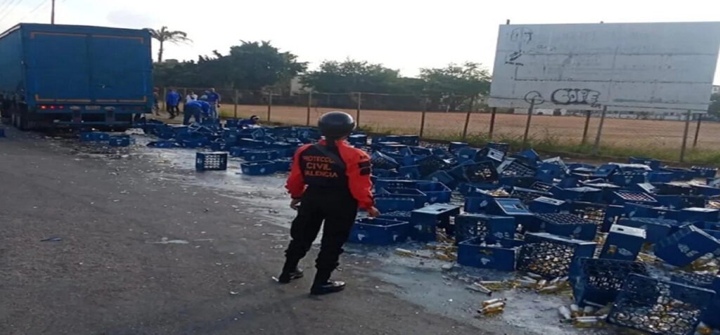 Camión perdió su carga tras un accidente vial en Carabobo-. El conductor de un camión de la Empresa Polar perdió la carga en un hecho vial registrado cerca de la autopista circunvalación sur, frente al campo de béisbol de la urbanización Los Caobos, estado Carabobo.