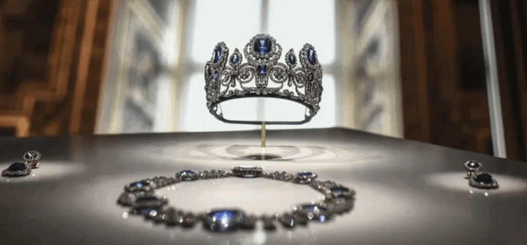 Una diadema de zafiro, un collar y un solo pendiente usados por varias reinas