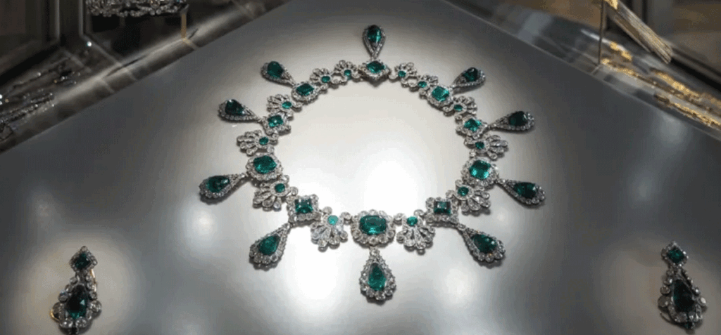 Regalo de bodas de Napoleón a su segunda esposa, María Luisa de Austria, en marzo de 1810, este ornamentado conjunto fue elaborado por el joyero François-Régnault Nitot e incluye 32 esmeraldas talladas intrincadamente y 1.138 diamantes.
