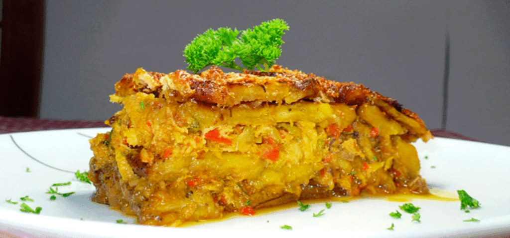 3. El Ensamblaje: En un caldero o bandeja previamente engrasada, se colocan capas en el siguiente orden: una base de huevo batido, una capa de papas, una de pescado, una de tajadas y, opcionalmente, una de aceitunas y pasitas. Se repite el proceso y se cubre con el resto del huevo.