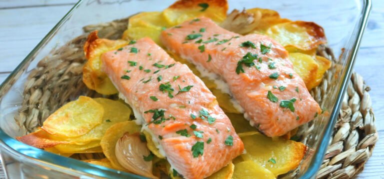 Prepara un delicioso salmón al horno con patatas y cebolla