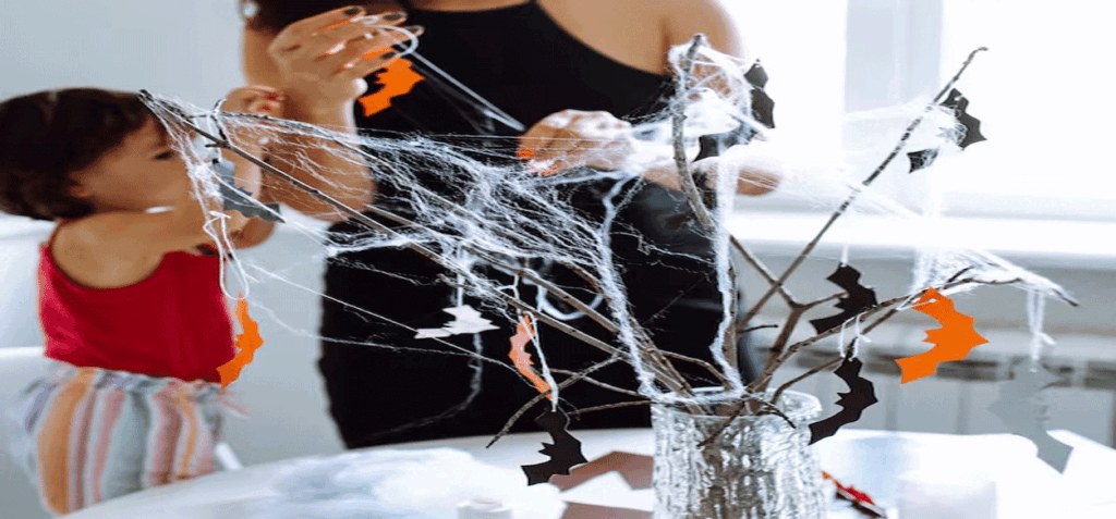 Una de las manualidades más sencillas: un jarrón vacío de casa, lo llenas de ramas secas (cuanto más finas mejor, para que el resultado sea mucho más bonito), enredas un poco de telaraña blanca y cuelgas murciélagos de cartulina en naranja o negro. Si quieres que los murciélagos tengan cierto brillo y que reflejen la luz al moverse, cambia las cartulinas con papeles satinados o brillantes.