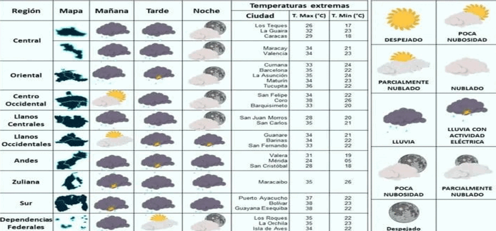 Mientras tanto, durante la tarde y la noche, se estiman áreas nubladas con la presencia de lluvias o chubascos, acompañados de ocasionales descargas eléctricas. Estas condiciones afectarán nuevamente a nuestra Guayana Esequiba, Delta Amacuro, Sucre, Anzoátegui, Monagas, Bolívar, Amazonas, los Llanos Occidentales, los Andes y Zulia. No se descartan algunas lluvias dispersas en la Región Central.
