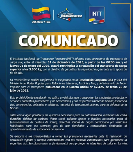 INTT anuncia que Transporte pesado tendrá restricción en Fin de Año -. El Instituto Nacional de Transporte Terrestre (INTT) anunció que desde este miércoles 31 de diciembre de 2025 a las 12:00 a. m. hasta el jueves 1° de enero de 2026, estará restringida la circulación de vehículos de carga pesada en todo el territorio nacional, como parte de un operativo especial por las festividades de Fin de Año. El objetivo es garantizar la seguridad vial y disminuir el riesgo de accidentes durante esta temporada de alta movilidad.