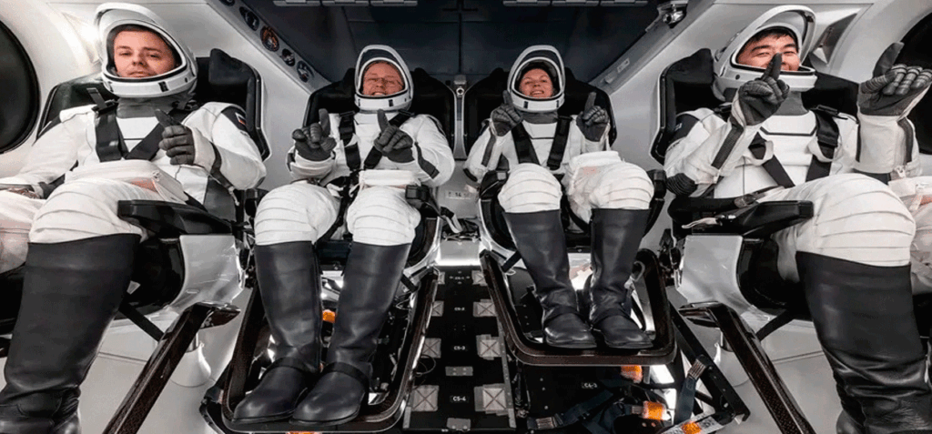 Tras un viaje de retorno de casi 11 horas desde el complejo orbital, la nave descendió suavemente bajo sus cuatro paracaídas principales. Los equipos de recuperación de la NASA y SpaceX, que ya esperaban en la zona, izaron la cápsula en menos de una hora para asistir a la tripulación compuesta por: