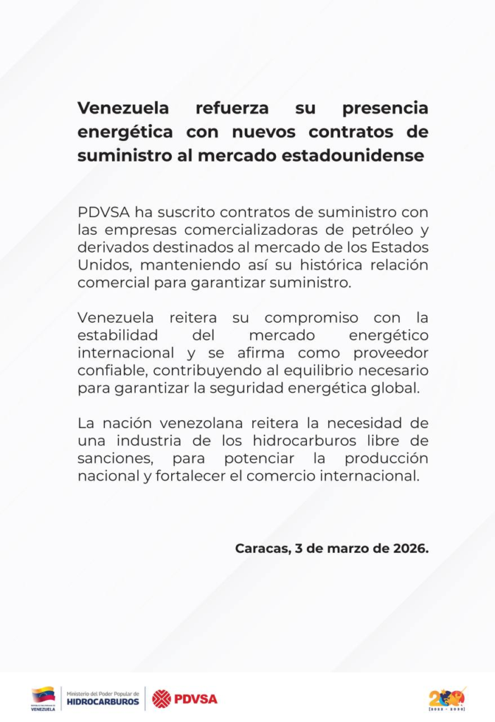 Pdvsa suscribe contratos de suministro petrolero para el mercado de EE.UU.-. La estatal Petróleos de Venezuela S.A. (Pdvsa) informó este martes 3 de marzo sobre la suscripción de contratos de suministro con empresas comercializadoras de petróleo y derivados destinados al mercado de Estados Unidos.