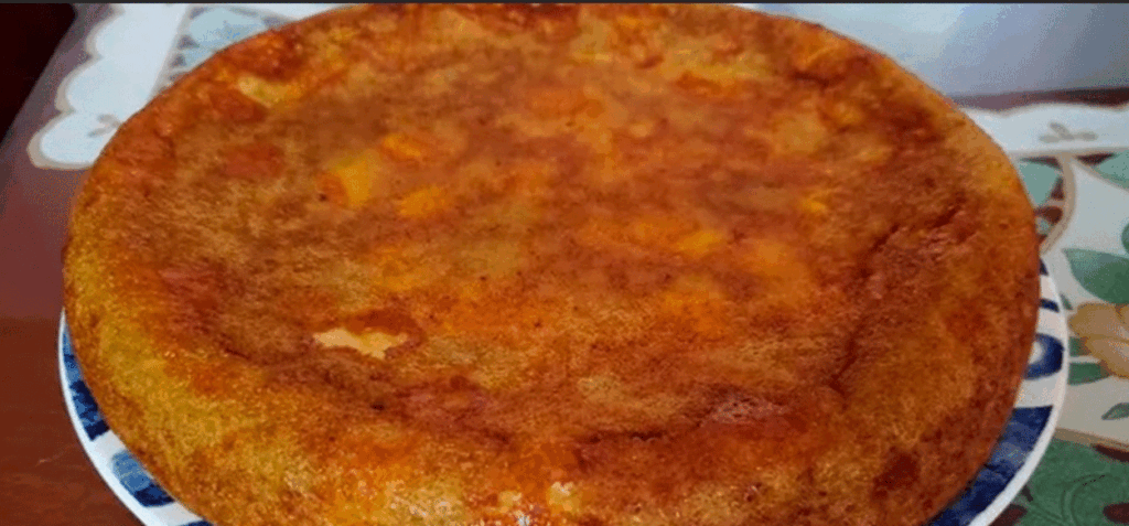 Enharinar y enmantequillar un molde redondo de aproximadamente 36 a 40 cm de diámetro. Volcar en el molde la tercera parte de la masa. Colocar una capa de tajadas usando la mitad de las tajadas, luego una taza de queso y una de papelón. Verter otra capa de la masa y repetir la colocación de la capa de plátanos, papelón y queso.