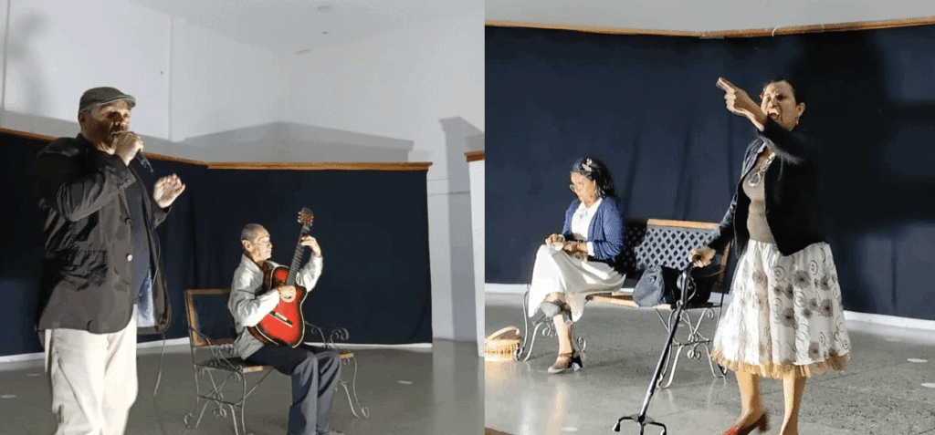 Dos personajes, Olimpia y Cantaralia, interpretados por Maestre y Rodríguez nos invitan a repensar la dinámica social y reír a carcajadas. “¡Apriete, comadre y borde! ¡Que yo tejo! ¡Para eso tenemos nuestra moral!” Dice Cantaralia. “¡Y muy elevada, Cantaralia, muy erguida!” Responde Olimpia. El público caicareño no dejó de aplaudir y agradecer el regreso del espacio cultural y recreativo.